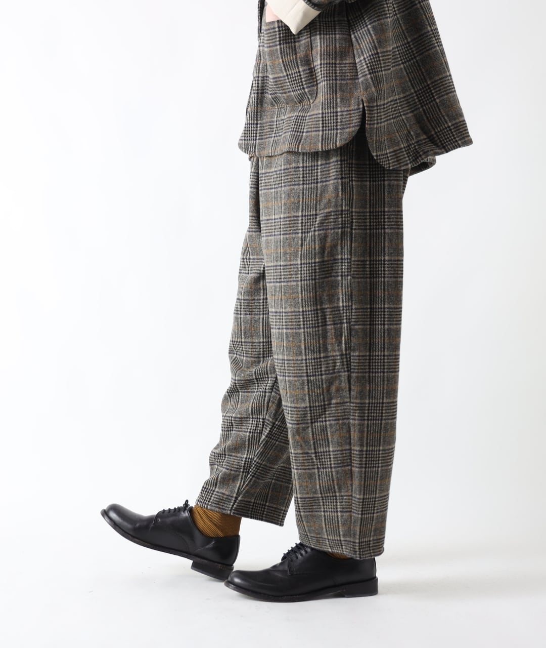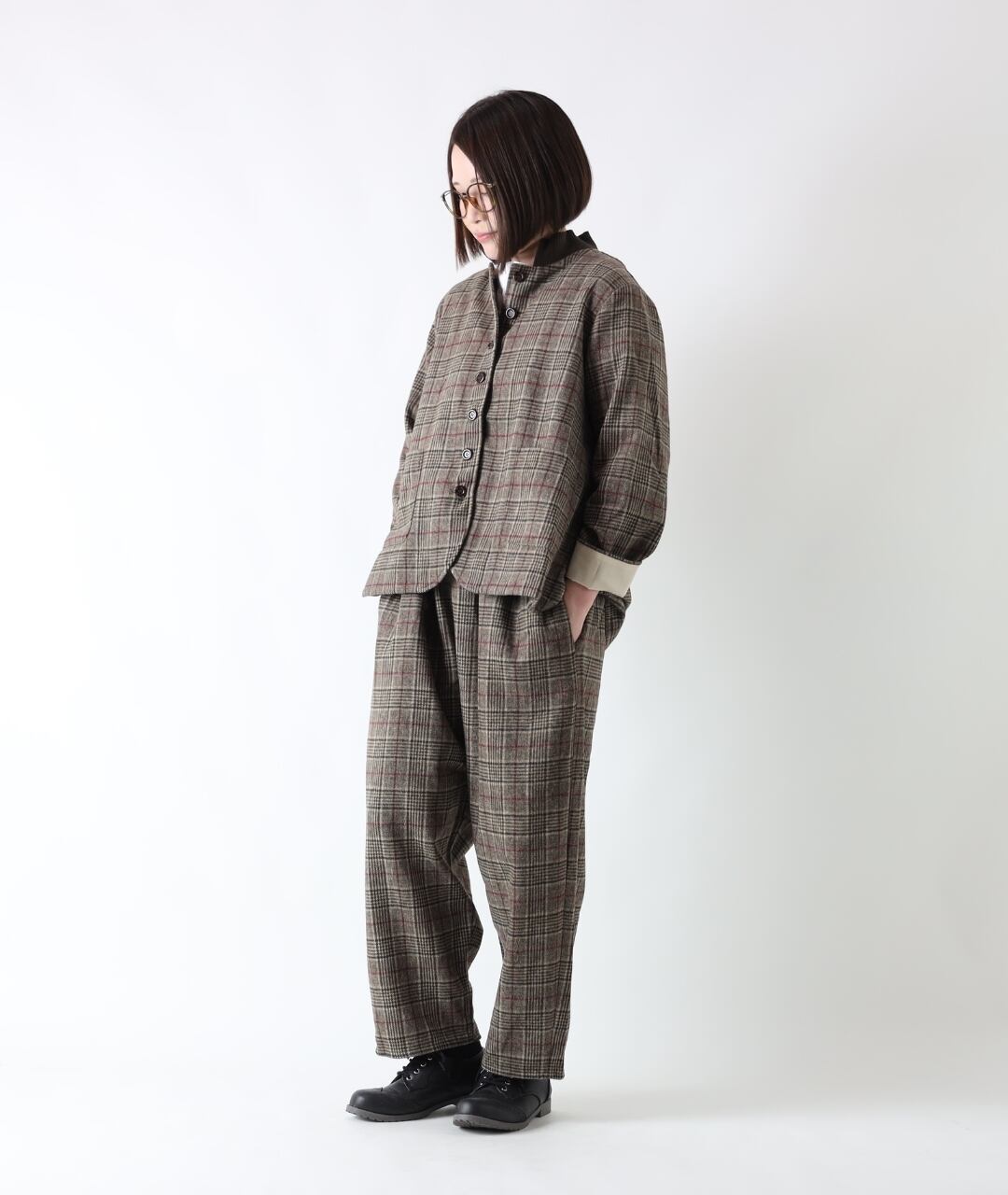 同素材のジャケットを合わせるとセットアップスタイルの完成。